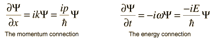 If we now take the partial derivatives of this wavefunction with respect to position and time, we can show that these derivatives are related to momentum and energy respectively.