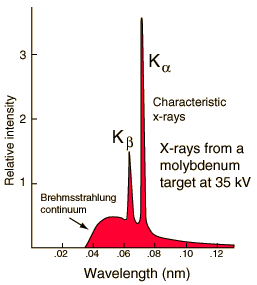 Characteristic x-rays are emitted from heavy elements when their electrons make transitions between the lower atomic energy levels. The characteristic x-rays emission which shown as two sharp peaks in the illustration at left occur when vacancies are produced in the n=1 or K-shell of the atom and electrons drop down from above to fill the gap. The x-rays produced by transitions from the n=2 to n=1 levels are called K-alpha x-rays, and those for the n=3->1 transiton are called K-beta x-rays.