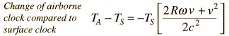 Aircraft Time DilationFor an aircraft flying over the equator, its clocks will show a time shift relative to a fixed surface clock which can be approximately modeled by the expression