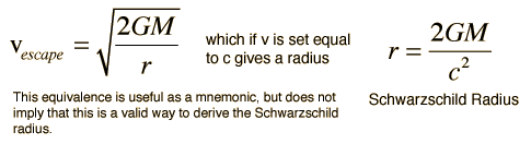 Escape Energy for PhotonIf the gravitational potential energy of the photon is exactly equal to the photon energy then![]() Note that this condition is independent of the frequency, and for a given mass M establishes a critical radius. Actually, Schwarzchilds's calculated gravitational radius differs from this result by a factor of 2 and is coincidently equal to the non-relativistic escape velocity expression ![]()