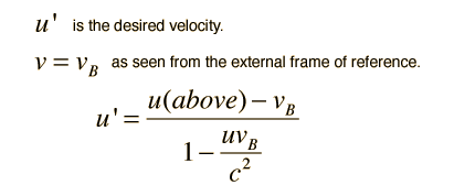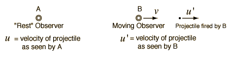 Einstein Velocity AdditionThe Einstein velocity relationship transforms a measured velocity as seen in one inertial frame of reference (u) to the velocity as measured in a frame moving at velocity v with respect to it (u'). In problems involving more than two objects, the main difficulty is the assignment of velocity to all the objects. ![]() If A sees B moving at velocity v, then a velocity measured by B (u') would be seen by A as: ![]() These relationships make perfect sense at low speeds where both denominators approach 1. |