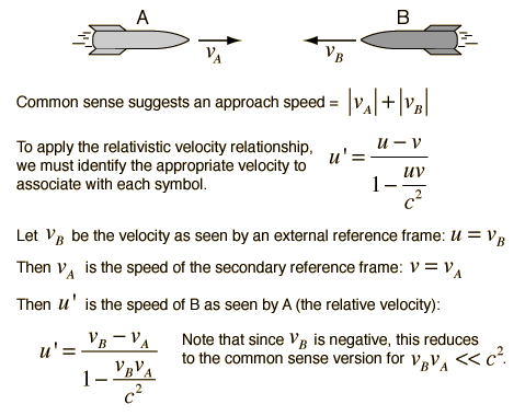 Relativistic Relative VelocityThe speed of light is the speed limit of the universe, so it follows that no observer will see any other observer approaching or receding at a speed greater than c. But what if observers A and B are both moving toward each other with speeds approaching c as seen by an external observer? How will A and B measure their relative speeds? This is an example of Einstein velocity addition. In the calculation below, velocities to the right are taken as positive. ![]() Exactly the same magnitude of velocity is obtained if you evaluate the approach velocity as observed by B. |