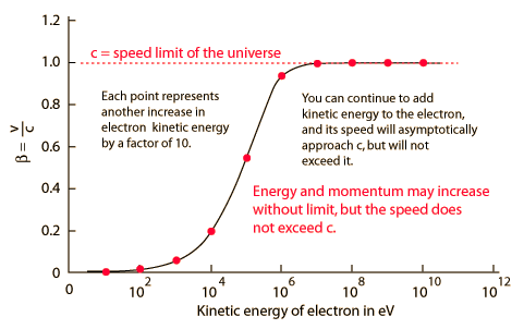 The speed of light c is said to be the speed limit of the universe because nothing can be accelerated to the speed of light with respect to you. A common way of describing this situation is to say that as an object approaches the speed of light, its mass increases and more force must be exerted to produce a given acceleration. There are difficulties with the "changing mass" perspective, and it is generally preferrable to say that the relativistic momentum and relativistic energy approach infinity at the speed of light. Since the net applied force is equal to the rate of change of momentum and the work done is equal to the change in energy, it would take an infinite time and an infinite amount of work to accelerate an object to the speed of light. (Sorry, Captain Kirk. We can't give you warp speed!)