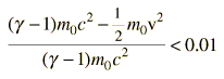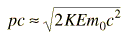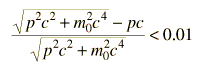 The relativistic kinetic energy differs from the non-relativistic form of kinetic energy by 1% when ![]() Solving this numerically gives g = 1.00673 , so the 1% error threshold for electrons is 3.4 keV and that for protons is 6.3 MeV. Taking another look at relativistic momentum, the exact expression for pc in terms of kinetic energy is ![]() but for low energies, the square of the kinetic energy in this expression can be neglected, giving the simpler approximate expression ![]() This simpler expression is accurate within 1% for electrons when KE < 20.7 keV and for protons when KE < 38 MeV. Looking at the extreme relativistic case, the particle energy can be approximated by the photon energy expression E = hc/l = pc when the rest mass energy is negligible compared to the kinetic energy. This approximation is accurate within 1% when ![]() The approximation E=pc is accurate within less than 1% for electrons when pc > 3.6 MeV and for protons when pc > 6.6 GeV .
