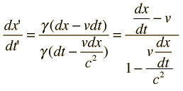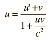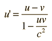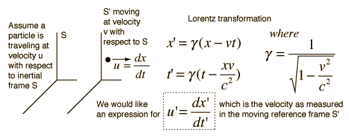 Relativistic Velocity TransformationNo two objects can have a relative velocity greater than c! But what if I observe a spacecraft traveling at 0.8c and it fires a projectile which it observes to be moving at 0.7c with respect to it!? Velocities must transform according to the Lorentz transformation, and that leads to a very non-intuitive result called Einstein velocity addition. ![]() Just taking the differentials of these quantities leads to the velocity transformation. Taking the differentials of the Lorentz transformation expressions for x' and t' above gives ![]() Putting this in the notation introduced in the illustration above: ![]() The reverse transformation is obtained by just solving for u in the above expression. Doing that gives ![]() Applying this transformation to the spacecraft traveling at 0.8c which fires a projectile which it observes to be moving at 0.7c with respect to it, we obtain a velocity of 1.5c/1.56 = 0.96c rather than the 1.5c which seems to be the common sense answer.