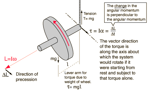 sense shown if it has that direction of spin. If the spin is reversed, it will precess in the opposite direction. The sense of precession is determined by the direction of the torque due to the weight of the spinning wheel. That torque is perpendicular to the angular momentum of the wheel.