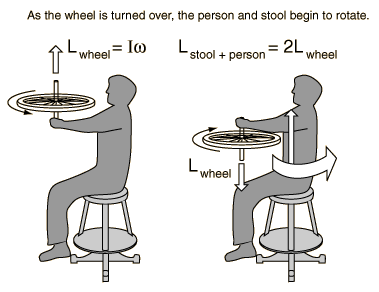 If the wheel is turned over, its angular momentum is now downward. But since there is nothing to exert a significant torque on the system, the angular momentum must have the original value upward. The man and the stool begin to rotate with angular momentum twice that of the wheel.