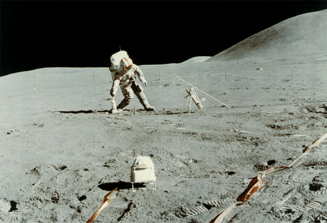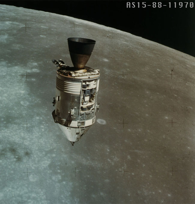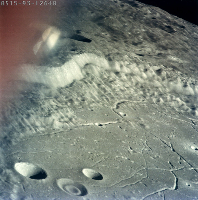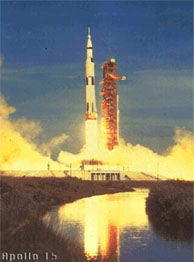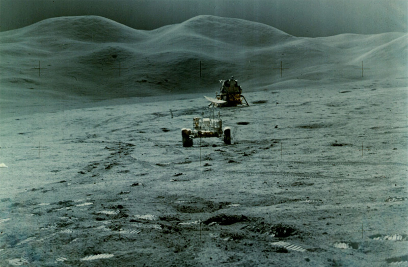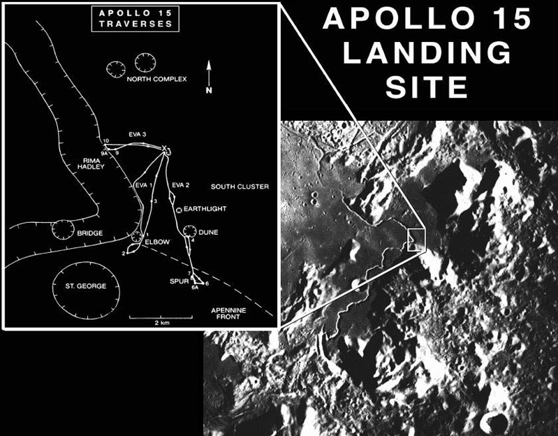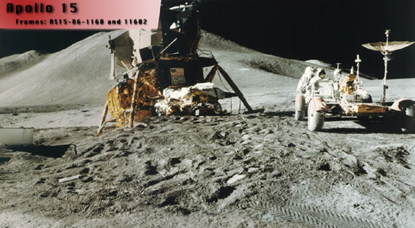 Launched on July 26, 1971, Apollo 15 featured a three-day stay on the Moon's surface and the use of the lunar rover to travel a distance of almost 28 km. There were more extensive geology investigations on three EVAs. There was also a deep space EVA. The Apollo 15 astronauts were David R. Scott, Alfred J. Worden and James B. Irwin. This was the first of the three advanced missions in the Apollo program and featured the use of the lunar rover for the first time. They were to survey and sample an area in the Hadley-Apennine region. They collected samples from the maria, the Apennine highlands, and an area along the Hadley Rille. |