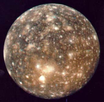 Callisto![]() Callisto is similar in appearance to Ganymede, but with more craters and fewer of the linear fault features. The large series of concentric rings on the image above is named Valhalla. It measures some 3000 km across and is evidence of some cataclysmic impact. It is as if there was an upthrust of partially melted ice, but it refroze before the ripples could subside. The density of craters in Valhalla indicate that it is very old, and there is no evidence of any recent tectonic activity. There is another large basin with similar features, the smaller Asgard imaged below.
