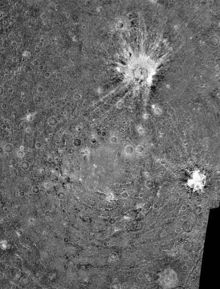 ![]() This four-frame mosaic shows the ancient impact structure Asgard on Jupiter's moon Callisto. This image is centered at 30 degrees north, 142 degrees west. The Asgard structure is approximately 1700 km across (1,056 mi) and consists of a bright central zone surrounded by discontinuous rings. The rings are tectonic features with scarps near the central zone and troughs at the outer margin. Several large impacts have smashed into Callisto after the formation of Asgard. The very young, bright-rayed crater Burr is located on the northern part of Asgard. Callisto is one of the largest four moons of Jupiter. These moons are called the "Galilean moons" because they were first observed by Galileo. Callisto orbits at about 26 Jupiter radii. It has a density of about 2000 kg/m^2 and is thought to be just an ice/rock mixture throughout. |