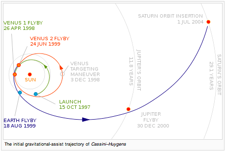 Cassini is an international space exploration mission. The Huygens probe, built by the European Space Agency, was launched to Titan, one of the moons of Saturn. Some of the experimental equipment was provided by ASI, the Italian space agency. The plan is for Cassini to travel more than 2.2 billion miles over a decade, carrying 18 experimental instruments. From NASA/JPL's Cassini site intro: "Cassini completed its initial four-year mission to explore the Saturn System in June 2008 and the first extended mission, called the Cassini Equinox Mission, in September 2010. Now, the healthy spacecraft is seeking to make exciting new discoveries in a second extended mission called the Cassini Solstice Mission. The mission's extension, which goes through September 2017, is named for the Saturnian summer solstice occurring in May 2017. The northern summer solstice marks the beginning of summer in the northern hemisphere and winter in the southern hemisphere. Since Cassini arrived at Saturn just after the planet's northern winter solstice, the extension will allow for the first study of a complete seasonal period. Cassini launched in October 1997 with the European Space Agency's Huygens probe. The probe was equipped with six instruments to study Titan, Saturn's largest moon. It landed on Titan's surface on Jan. 14, 2005, and returned spectacular results. Meanwhile, Cassini's 12 instruments have returned a daily stream of data from Saturn's system since arriving at Saturn in 2004." References:
