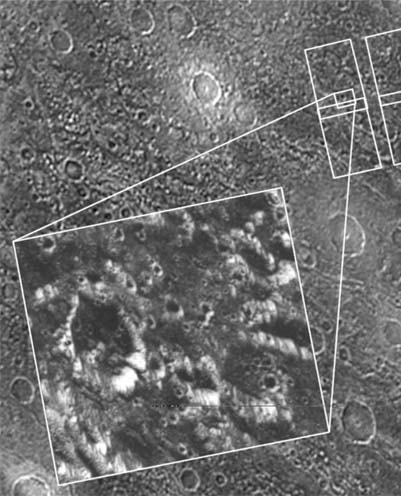 The frame at left was taken by the Voyager 2 spacecraft when it flew by in 1979, with a resolution of about 1.3 kilometers (0.8 mile) per pixel. The frame at right showing the same area was captured by Galileo during its first flyby of Ganymede on June 27, 1996; it has a resolution of about 74 meters (243 feet) per pixel, more than 17 times better than that of the Voyager image. In each of the above frames, north is to the top, and the sun illuminates the surface from the lower left nearly overhead (about 77 degrees above the horizon). The area shown, at latitude 10 degrees north, 167 degrees west, is about 35 by 55 kilometers (25 by 34 miles). The image was taken June 27 when Galileo was 7,448 kilometers (4.628 miles) away from Ganymede.