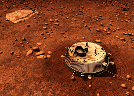 Huygens Probe from the Cassini MissionThe Huygens probe was launched to Saturn's moon Titan from the Cassini spacecraft. The probe separated from the Cassini orbiter on December 25, 2004, and landed on Titan on January 14, 2005. This was the first landing ever accomplished in the outer solar system. It touched down on land, although the possibility that it would touch down in an ocean was also taken into account in its design. The probe continued to send data for about 90 minutes after reaching the surface.