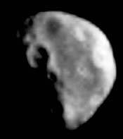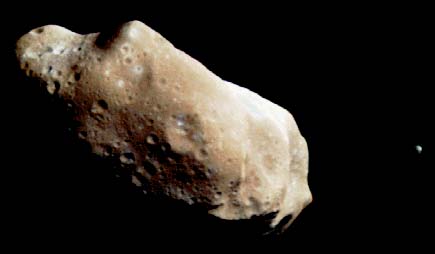 Ida and MoonIda is an asteroid which became much more familiar with its close encounter with the planetary explorer spacecraft Galileo. In 1993, Galileo's rendevous with Ida brought the surprise discovery that Ida had its own satellite: a tiny moon about 1.5 km in diameter orbiting at a distance of about 90 km. The moon was named Dactyl. ![]() This color picture is made from images taken by the imaging system on the Galileo spacecraft about 14 minutes before its closest approach to Ida on August 28, 1993. The range from the spacecraft was about 10,500 km. The images are from the sequence in which Ida's moon was originally discovered. The maximum dimension of Ida is about 60 km. This picture is made from images through the 410 nm (violet), 756 nm (infrared) and 968 nm (infrared) filters. The color is enhanced in the sense that the camera is sensitive to near-infrared wavelengths of light beyone human vision; a natural color picture of this asteroid would appear mostly gray. Shadings in this image indicate changes in illumination angle on the many steep slopes of this irregular body as well as subtle color variations due to differences in the physical state and composition of the soil (regolith). There are brighter areas, appearing bluish in the picture, around the small bright crater near the center of the asteroid, and near the upper righthand limb. This is a combination of more reflected blue light and greater absorption of near infrared light, suggesting a difference in the abundance of iron-bearing minerals in these areas. From the analysis of the binary orbit of the moon Dactyl around Ida, Petit* determined the mass of Ida to be about 2.2 x 10-14 solar masses or 4.3 x 1016 kg and its density to be 2.7 +/- .4 g/cm3. *Petit, J.-M., Durda, D.D., Greenberg, R., Hurford, T.A., & Geissler, P.E. 1997, The Long-Term Dynamics of Dactyl's Orbit, Icarus,139, 177-197Sources