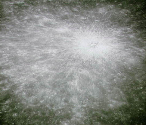 At left above is an image of the South polar region of the Moon constructed from about 1500 Clementine images. The projection is orthographc, centered on the south pole. The Schrodinger Basin (320 km in diameter) is located in the lower right of the mosaic. Amundsen-Ganswindt is the more subdued circular basin between Schrodinger and the pole. The polar regions of the moon are of special interest because of the postulated occurrence of ice in permanently shadowed areas. The south pole is of greater interest because the area that remains in shadow is much larger than that at the north pole. At right above is a similar lunar mosaic of ~1500 Clementine images of the north polar region of the moon. The projection is orthographic centered on the north pole. The north pole of the moon is absent of the very rugged terrain seen at the south pole. These descriptions are excerpted from the original NASA captions released with the images. ![]() This image shows the limb of the Copernicus Impact Crater and was made by Lunar Orbiter II. Its creation date is listed as June 1, 1991. Copernicus is 93 km wide and is located within the Mare Imbrium Basin, northern nearside of the Moon (10 degrees N., 20 degrees W.). The image shows crater floor, floor mounds, rim, and rayed ejecta. Rays from the ejecta are superposed on all other surrounding terrains which places the crater in its namesake age group: the Copernican system, established as the youngest assemblage of rocks on the Moon (Shoemaker and Hackman, 1962, The Moon: London, Academic Press, p.289- 300). (From the original NASA caption released with the image.) ![]() NASA Image from Apollo 8 Spacecraft This rightly-rayed crater on the farside of the moon was photographed by Apollo 8 on December 24, 1968.The imaged area is near the subsolar point, where the sun was directly overhead as seen from the Apollo 8 spacecraft. Brightly-rayed craters are numerous on the lunar frontside; however, they had not been previously observed in such detail on the farside (excerpted from the original NASA caption released with the image.)