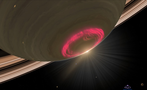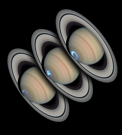 Saturn Aurora![]() The ultraviolet image of the southern polar region of Saturn with its aurora was taken on January 28, 2004 by the Hubble Space Telescope's Imaging Spectrograph. The visible part of the image was taken by Erich Karkoschka of the University of Arizona using the telescope's Advanced Camera for Surveys on March 22, 2004. The ultraviolet image was transferred to the visible blue to show the geometry of the auroral display and superimposed upon the subsequently obtained visible image, as I understand it. Photo credit: NASA, ESA, J. Clarke (Boston University), and Z. Levay (STScI). ![]() The ultraviolet parts of these three superimposed images were taken on January 24,26, and 28, 2004. This shows the dynamic nature of the auroral display. On Earth, auroral storms may develop in about 10 minutes last for a few hours, whereas Saturn's auroral displays always appear bright and may last for several days (NASA). "The observations, made by Hubble and the Cassini spacecraft, while enroute to the planet, suggest that Saturn's auroral storms are driven mainly by the pressure of the solar wind -- a stream of charged particles from the Sun -- rather than by the Sun's magnetic field. The aurora's strong brightening on Jan. 28, 2004 corresponds with the recent arrival of a large disturbance in the solar wind. The image shows that when Saturn's auroras become brighter (and thus more powerful), the ring of light encircling the pole shrinks in diameter."(NASA) ![]()