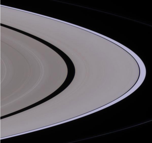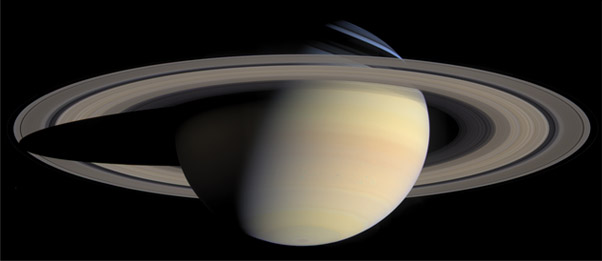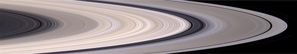 Saturn Images from CassiniThe voyage of the Cassini spacecraft has yielded an abundance of information about Saturn and its moons. These are some of the detailed images of Saturn and its ring system taken on the Cassini mission. For more information about the Cassini-Huygens mission visit http://saturn.jpl.nasa.gov/home/index.cfm. The Cassini imaging team homepage is at http://ciclops.org. The images and descriptions here are taken from the NASA websites. ![]() While cruising around Saturn in early October 2004, Cassini captured a series of images that have been composed into the largest, most detailed, global natural color view of Saturn and its rings ever made. This grand mosaic consists of 126 images acquired in a tile-like fashion, covering one end of Saturn's rings to the other and the entire planet in between. The images were taken over the course of two hours on Oct. 6, 2004, while Cassini was approximately 6.3 million kilometers (3.9 million miles) from Saturn. Since the view seen by Cassini during this time changed very little, no re-projection or alteration of any of the images was necessary. Three images (red, green and blue) were taken of each of 42 locations, or "footprints," across the planet. The full color footprints were put together to produce a mosaic that is 8,888 pixels across and 4,544 pixels tall. The smallest features seen here are 38 kilometers (24 miles) across. Many of Saturn's splendid features noted previously in single frames taken by Cassini are visible in this one detailed, all-encompassing view: subtle color variations across the rings, the thread-like F ring, ring shadows cast against the blue northern hemisphere, the planet's shadow making its way across the rings to the left, and blue-grey storms in Saturn's southern hemisphere to the right. Tiny Mimas and even smaller Janus are both faintly visible at the lower left. The Sun-Saturn-Cassini, or phase, angle at the time was 72 degrees; hence, the partial illumination of Saturn in this portrait. Later in the mission, when the spacecraft's trajectory takes it far from Saturn and also into the direction of the Sun, Cassini will be able to look back and view Saturn and its rings in a more fully-illuminated geometry. Image Credit: NASA/JPL/Space Science Institute ![]() Saturn's sunlit rings gleam in the blackness as two icy moons cruise past in the foreground. Enceladus (505 kilometers, or 314 miles across) is a small crescent near upper left; Janus (181 kilometers, or 113 miles across) is a speck above the F ring, near center. Janus was brightened slightly for visibility. This view looks toward the lit side of the rings from about 5 degrees below the ringplane. This image was taken in visible red light with the Cassini spacecraft wide-angle camera on Nov. 7, 2006, at a distance of approximately 1.1 million kilometers (700,000 miles) from Saturn and at a sun-Saturn-spacecraft, or phase, angle of 139 degrees. Image scale on the sky at the distance of Saturn is 63 kilometers (39 miles) per pixel. ![]() This view is from Cassini's vantage point beneath the ring plane. The rings are tilted away from Cassini at an angle of about 4 degrees. Images taken using red, green and blue spectral filters were used to create this natural color mosaic. The images were acquired using the Cassini spacecraft narrow angle camera on Dec. 12, 2004, at a distance of approximately 1.8 million kilometers (1.1 million miles). ![]() ![]() ![]() ![]() The best view of Saturn's rings in the ultraviolet indicates there is more ice toward the outer part of the rings, than in the inner part, hinting at the origins of the rings and their evolution. Images taken during the Cassini spacecraft's orbital insertion on June 30 show compositional variation in the A, B and C rings. From the inside out, the "Cassini Division" in faint red at left is followed by the A ring in its entirety. The Cassini Division at left contains thinner, dirtier rings than the turquoise A ring, indicating a more icy composition. The red band roughly three-fourths of the way outward in the A ring is known as the Encke gap. The ring system begins from the inside out with the D, C, B and A rings followed by the F, G and E rings. The red in the image indicates sparser ringlets likely made of "dirty," and possibly smaller, particles than in the icier turquoise ringlets. This image was taken with the Ultraviolet Imaging Spectrograph instrument, which is capable of resolving the rings to show features up to 97 kilometers (60 miles) across, roughly 100 times the resolution of ultraviolet data obtained by the Voyager 2 spacecraft. The Cassini-Huygens mission is a cooperative project of NASA, the European Space Agency and the Italian Space Agency. The Jet Propulsion Laboratory, a division of the California Institute of Technology in Pasadena, manages the mission for NASA's Science Mission Directorate, Washington, D.C. The Cassini orbiter and its two onboard cameras were designed, developed and assembled at JPL. The imaging operations center is based at the Space Science Institute in Boulder, Colo. | Index Solar System Illustration Solar System Concepts | ||||||