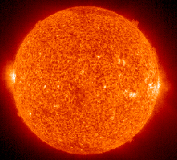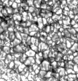 The visible surface of the Sun (the photosphere) has a granular appearance with a typical dimension of a granule being 1000 kilometers. The image at right is from the NASA Solar Physics website and is credited to G. Scharmer and the Swedish Vacuum Solar Telescope. The granules are described as convection cells which transport heat from the interior of the Sun to the surface. |