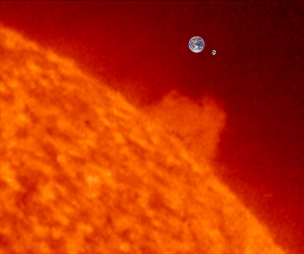 The Sun's diameter of 1,392,000 km is 109 times the Earth's equatorial diameter of 12,756 km. The distance to the Earth from the sun at 149,000,000 km = 1 AU is 107 times the diameter of the Sun and 388 times the Earth-Moon distance. The Earth-Moon distance is not shown to scale in the above composite. The diameter of the Sun is 3.6 times the Earth-Moon distance. Above, the Earth and Moon are scaled relative to an image of the Sun made by the SOHO satellite on January 12, 2007. |