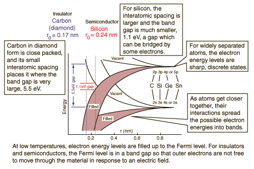 Energy Bands:Insulators and SemiconductorsThe energy bands for the outermost electrons are qualitatively similar for carbon, silicon, germanium and tin. Though they will differ in detail, the generic band diagram below can show why these materials have different electrical properties. ![]()