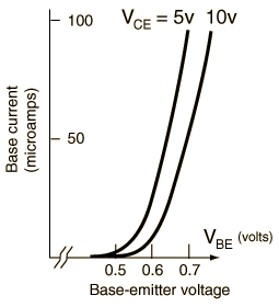 The entire normal range of silicon transistor operation involves a change in base-emitter voltage of only about two-tenths of a volt. This is because the base-emitter diode is forward biased. One of the constraints on transistor action is that this voltage remains at about 0.6 volts (often referred to as the diode drop). A small change in VBE can produce a large change in collector current and achieve current amplification.