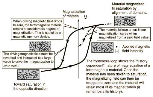 HysteresisWhen a ferromagnetic material is magnetized in one direction, it will not relax back to zero magnetization when the imposed magnetizing field is removed. It must be driven back to zero by a field in the opposite direction. If an alternating magnetic field is applied to the material, its magnetization will trace out a loop called a hysteresis loop. The lack of retraceability of the magnetization curve is the property called hysteresis and it is related to the existence of magnetic domains in the material. Once the magnetic domains are reoriented, it takes some energy to turn them back again. This property of ferrromagnetic materials is useful as a magnetic "memory". Some compositions of ferromagnetic materials will retain an imposed magnetization indefinitely and are useful as "permanent magnets". The magnetic memory aspects of iron and chromium oxides make them useful in audio tape recording and for the magnetic storage of data on computer disks. |