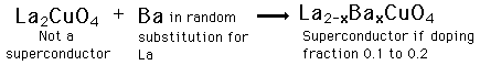 Lanthanum-Barium-Copper-OxideAs the first of a new class of high-temperature superconductors, this superconductor has generated an enormous amount of research (18,000 publications in 4 years). The understanding which has emerged is that copper-oxide layers provide the path for current. These copper-oxide layers are separated by layers of other atoms which serve as spacers and charge reservoirs. ![]()