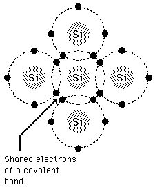 The main point here is that a silicon atom has four electrons which it can share in covalent bonds with its neighbors. These simplified diagrams do not do justice to the nature of that sharing since any one silicon atom will be influenced by more than four other silicon atoms, as may be appreciated by looking at the silicon unit cell.