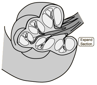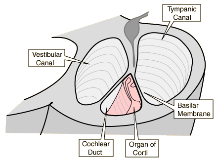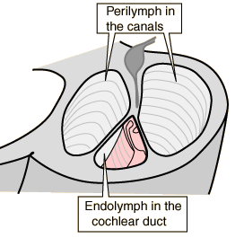 Section of CochleaThe cochlea has three fluid filled sections. The perilymph fluid in the canals differs from the endolymph fluid in the cochlear duct. The organ of Corti is the sensor of pressure variations. ![]() |