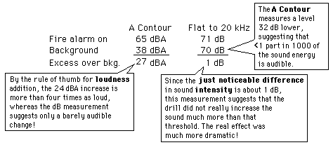 Analysis, Fire Alarm SoundSound measurement in decibels inside of buildings can be so misleading as to be worthless since it gives equal weighting to low frequency building sounds to which the human ear has minimal response. This example shows that the use of an A Contour filter gives a much better representation of what the ear hears. Besides the conceptual difference between sound loudness and sound intensity, this example employs the ideas of the just noticeable difference in sound level and the "rule of thumb" for adding loudness. ![]()