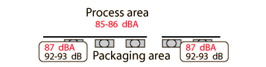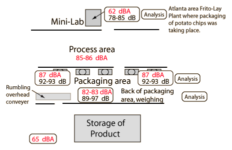 Factory Sound MeasurementsThe sound level was quite high in the area where high-speed packaging equipment was operating. The level of 87 dBA is just under the level where OSHA requirements dictate the provision of hearing protection if employees are subjected to it for 8 hours. ![]() Such hearing protection in the form of ear covers had been provided. Sets were hanging around in the packaging area, but no employees were wearing them. The small difference of 5-6 dB between the A contour and straight decibel measurements indicates that most of the sound energy was at mid-range frequencies where the A-contour and the human ear are most receptive.