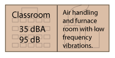 This highlights the futility of doing only flat decibel measurements inside of buildings. A combination of dB and dBA measurements gives a fairly balanced picture of the sound environment. In this extraordinary case, a great deal of effort had been made to sound-insulate the air-handling room, and this effort had indeed greatly reduced the audible sound transmission into the classroom. But very low frequency sounds vibrate the structures and are much more efficiently structure-borne to different locations in the building. The room was indeed fairly quiet to the ear, although you could feel a bit of the vibration in the floor. Some of that low frequency vibration was picked up by the high quality sound level meter when it was set to measure decibels, even though the ear was barely aware of it and the A-contour filter of the meter appropriately eliminated it. |