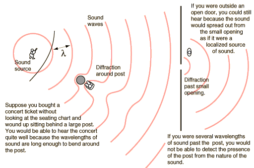 Diffraction of SoundDiffraction: the bending of waves around small* obstacles and the spreading out of waves beyond small* openings. * small compared to the wavelength![]() Important parts of our experience with sound involve diffraction. The fact that you can hear sounds around corners and around barriers involves both diffraction and reflection of sound. Diffraction in such cases helps the sound to "bend around" the obstacles. The fact that diffraction is more pronounced with longer wavelengths implies that you can hear low frequencies around obstacles better than high frequencies, as illustrated by the example of a marching band on the street. Another common example of diffraction is the contrast in sound from a close lightning strike and a distant one. The thunder from a close bolt of lightning will be experienced as a sharp crack, indicating the presence of a lot of high frequency sound. The thunder from a distant strike will be experienced as a low rumble since it is the long wavelengths which can bend around obstacles to get to you. There are other factors such as the higher air absorption of high frequencies involved, but diffraction plays a part in the experience. You may perceive diffraction to have a dual nature, since the same phenomenon which causes waves to bend around obstacles causes them to spread out past small openings. This aspect of diffraction also has many implications. Besides being able to hear the sound when you are outside the door as in the illustration above, this spreading out of sound waves has consequences when you are trying to soundproof a room. Good soundproofing requires that a room be well sealed, because any openings will allow sound from the outside to spread out in the room - it is surprising how much sound can get in through a small opening. Good sealing of loudspeaker cabinets is required for similar reasons. Another implication of diffraction is the fact that a wave which is much longer than the size of an obstacle, like the post in the auditorium above, cannot give you information about that obstacle. A fundamental principle of imaging is that you cannot see an object which is smaller than the wavelength of the wave with which you view it. You cannot see a virus with a light microscope because the virus is smaller than the wavelength of visible light. The reason for that limitation can be visualized with the auditorium example: the sound waves bend in and reconstruct the wavefront past the post. When you are several sound wavelengths past the post, nothing about the wave gives you information about the post. So your experience with sound can give you insights into the limitations of all kinds of imaging processes.