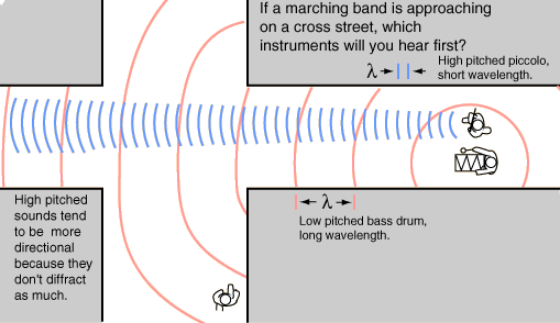 ![]() The long wavelength sounds of the bass drum will diffract around the corner more efficiently than the more directional, short wavelength sounds of the higher pitched instruments. |