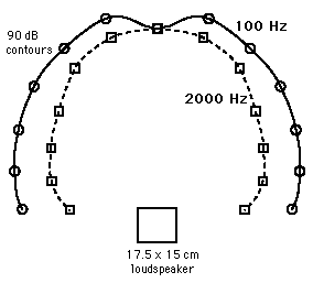 Note that the wavelength of the 100 Hz sound is about 3.45 meters, much larger than the speaker, while that of the 2000 Hz sound is about 18 cm, about the size of the speaker. The realities of diffraction may affect your choice of loudspeakers for your personal listening. Very small loudspeakers are often promoted as having sound just as good as a large loudspeaker. There is reason to be skeptical about such claims on physical grounds. Large speakers are inherently more efficient in producing bass frequencies into a room just because their size compares more favorably with the wavelengths of those sounds. Even if that basic problem is overcome by electronic equalization of the sound input to the speakers and the design of the crossover networks which provide the signal to the different components of the loudspeaker, there is no escaping the implications of diffraction. Small loudspeakers will spread the bass frequencies considerably more than the high frequencies. This difference between the equal-loudness patterns of highs and lows becomes more and more pronounced as you produce smaller and smaller speakers. So you might conceivably get equivalent sound directly on-axis with the speaker, but as you move away from the axis, the high frequencies will drop off more rapidly than the lows. Practically, this limits the audience region for optimal listening. It might be fairly said that if the speakers are just for you, you might be satisfied with the small speakers because you can position yourself at the ideal-listener location. But if you have guests, they will not be as satisfied because of the greater off-axis variations from the small speakers. |