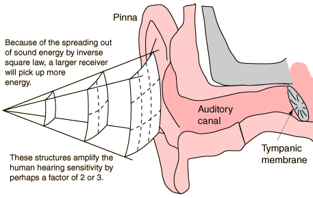 The Outer EarSound energy spreads out from its sources. For a point source of sound, it spreads out according to the inverse square law. For a given sound intensity, a larger ear captures more of the wave and hence more sound energy. The outer ear structures act as part of the ear's preamplifier to enhance the sensitivity of hearing. ![]() The auditory canal acts as a closed tube resonator, enhancing sounds in the range 2-5 kiloHertz. |