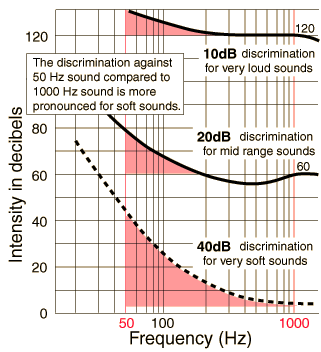 One of the implications of this aspect of human hearing is that you will perceive a progressive loss of bass frequencies as a given sound becomes softer and softer. For example if you are listening to a recording of an orchestra and you turn the volume down, you will find that the bass instruments are less and less prominent. This is the purpose of the so-called "loudness contours" on audio amplifiers; they allow you to boost the bass frequencies when you are listening at low sound levels to give you a more realistic balance of the high and low frequencies in the music. This aspect of human hearing has important implications for the design of auditoriums for music performance. As the sound gets softer toward the back of the auditorium, the listener will perceive a loss of bass frequencies, an undesirable condition. To overcome this "bass loss problem", auditorium designs must attempt to provide some reinforcement of the low frequencies.