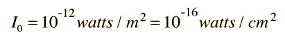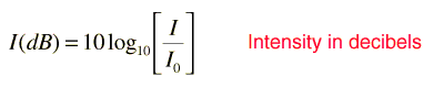 Sound IntensitySound intensity is defined as the sound power per unit area. The usual context is the measurement of sound intensity in the air at a listener's location. The basic units are watts/m2 or watts/cm2 . Many sound intensity measurements are made relative to a standard threshold of hearing intensity I0 : ![]() The most common approach to sound intensity measurement is to use the decibel scale: ![]() Decibels measure the ratio of a given intensity I to the threshold of hearing intensity , so that this threshold takes the value 0 decibels (0 dB). To assess sound loudness, as distinct from an objective intensity measurement, the sensitivity of the ear must be factored in. |
