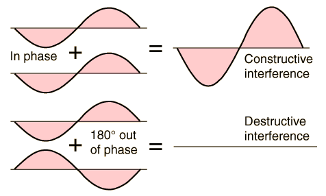 Interference of SoundTwo traveling waves which exist in the same medium will interfere with each other. If their amplitudes add, the interference is said to be constructive interference, and destructive interference if they are "out of phase" and subtract. Patterns of destructive and constructive interference may lead to "dead spots" and "live spots" in auditorium acoustics. Interference of incident and reflected waves is essential to the production of resonant standing waves. Interference has far reaching consequences in sound because of the production of "beats" between two frequencies which interfere with each other.