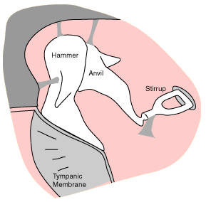 The three tiniest bones in the body form the coupling between the vibration of the eardrum and the forces exerted on the oval window of the inner ear. Formally named the malleus, incus, and stapes, they are commonly referred to in English as the hammer, anvil, and stirrup.