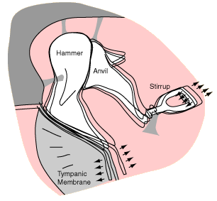 The vibration of the eardrum is transmitted to the oval window of the inner ear by means of the ossicles, which achieve an amplification by lever action. The lever is adjustable under muscle action and may actually attenuate loud sounds for protection of the ear.