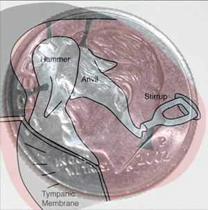 A physiology book describes the ossicles as small enough to fit collectively on a U.S. dime. The image to the right actually makes the ossicles a bit too large - they may be half that large in some persons.