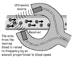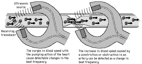 Doppler Pulse DetectionThe Doppler effect in an ultrasonic pulse probe detects the reflected sound from moving blood. The frequency of the reflected sound is different, and the beat frequency between the direct and reflected sounds can be amplified and used in earphones to hear the pulse sound. ![]()