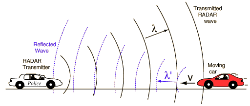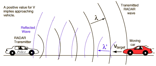 Police RADARRADAR speed detectors bounce microwave radiation off of moving vehicles and detect the reflected waves. These waves are shifted in frequency by the Doppler effect, and the beat frequency between the directed and reflected waves provides a measure of the vehicle speed. ![]()