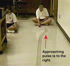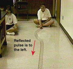 Phase Change in Slinky Wave![]() ![]() A wave reflected at a fixed end will undergo a 180 degree phase change upon reflection. This is instrumental in producing standing waves or resonance in vibrating strings. Experimenters are Kelly Jewett (right), Lisa White and Kim Wimpey.