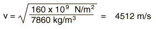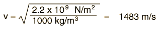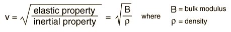 Wave SpeedsThe propagation speeds of traveling waves are characteristic of the media in which they travel and are generally not dependent upon the other wave characteristics such as frequency, period, and amplitude. The speed of sound in air and other gases, liquids, and solids is predictable from their density and elastic properties of the media (bulk modulus). In a volume medium the wave speed takes the general form ![]() This relationship works fairly well for water with tabulated values: ![]() This agrees well with the measured speed of sound in water, 1482 m/s at 20°C. The situation with solids is considerably more complicated, with different wave speeds in different directions, in different kinds of geometries, and differences between transverse and longitudinal waves. For example, a general tabulated value for the bulk modulus of steel gives a sound speed for structural steel of ![]() Comparing to one tabulated example for stainless steel shows wide variation between the speed for longitudinal and transverse waves, with this calculated value somewhere in between.