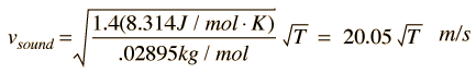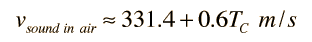 Doing this calculation for air at 0°C gives vsound = 331.39 m/s and at 1°C gives vsound = 332.00 m/s. This leads to a commonly used approximate formula for the sound speed in air: