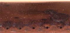 | A series of small holes were drilled at regular intervals in the pipe. They appeared to be about 8 mm apart.  |