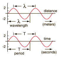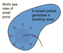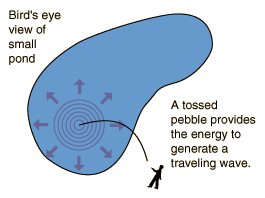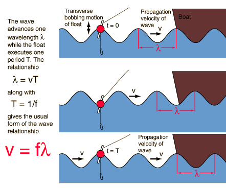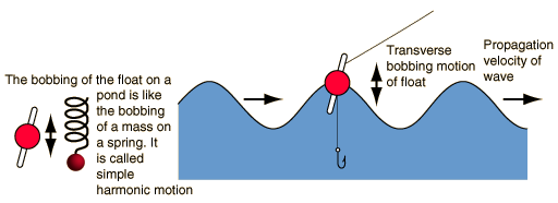 A pebble thrown into a pond will produce concentric circular ripples which move outward from the point of impact. If a fishing float is in the water, the float will bob up and down as the wave moves by. This is a characteristic of transverse waves. Such waves obey the wave relationship. |