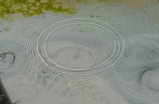 This is an example of the transverse waves produced by bubbles rising from the bottom of this clear pool along the Icefields Parkway in Alberta, Canada. Although not exactly a circle, and not exactly a sine wave, these ripples show the tendency of surface disturbances to produce traveling waves in all directions from the source.